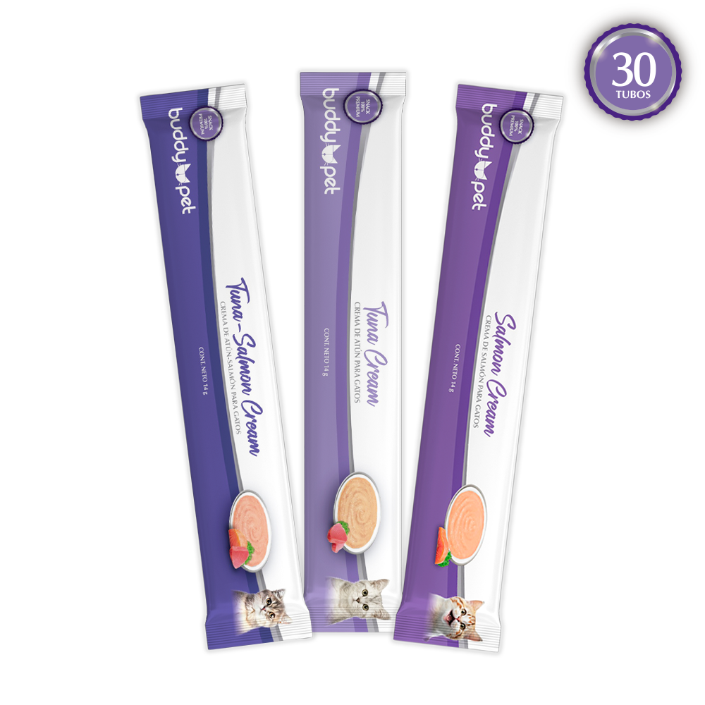 Buddy Pet Cream Snack Mix es un delicioso mix de snacks cremosos para gatos, ideal como premio o complemento diario. Contiene 30 tubos individuales, 10 de cada sabor en tres irresistibles variedades: atún, salmón y atún con salmón. Su textura suave y su fórmula enriquecida con taurina y vitaminas ayudan a mantener una nutrición equilibrada, apoyando la salud visual y el sistema inmunológico de tu gato. Contenido neto total: 420 g.